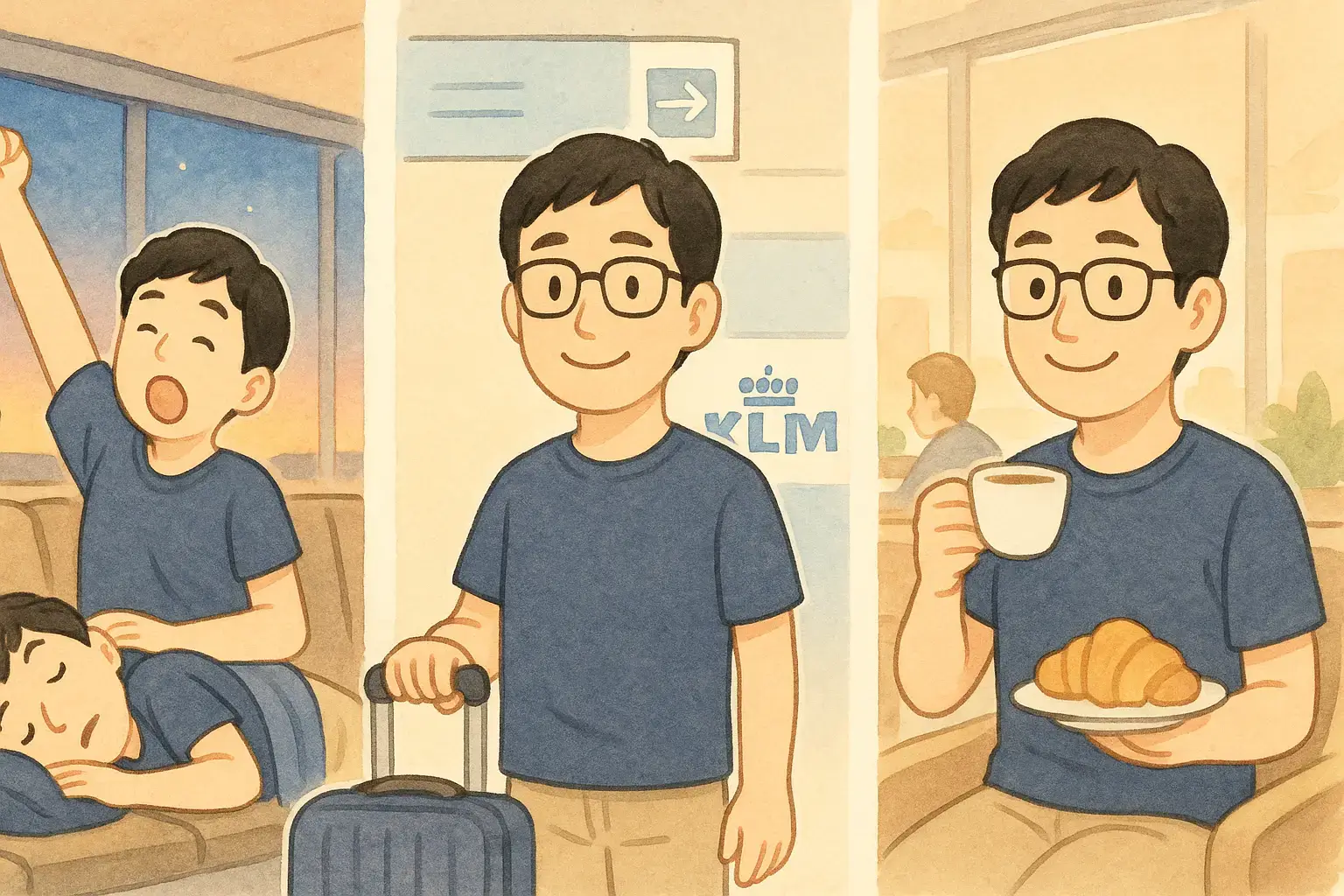KLMのチェックインやラウンジでの朝ごはんなど、