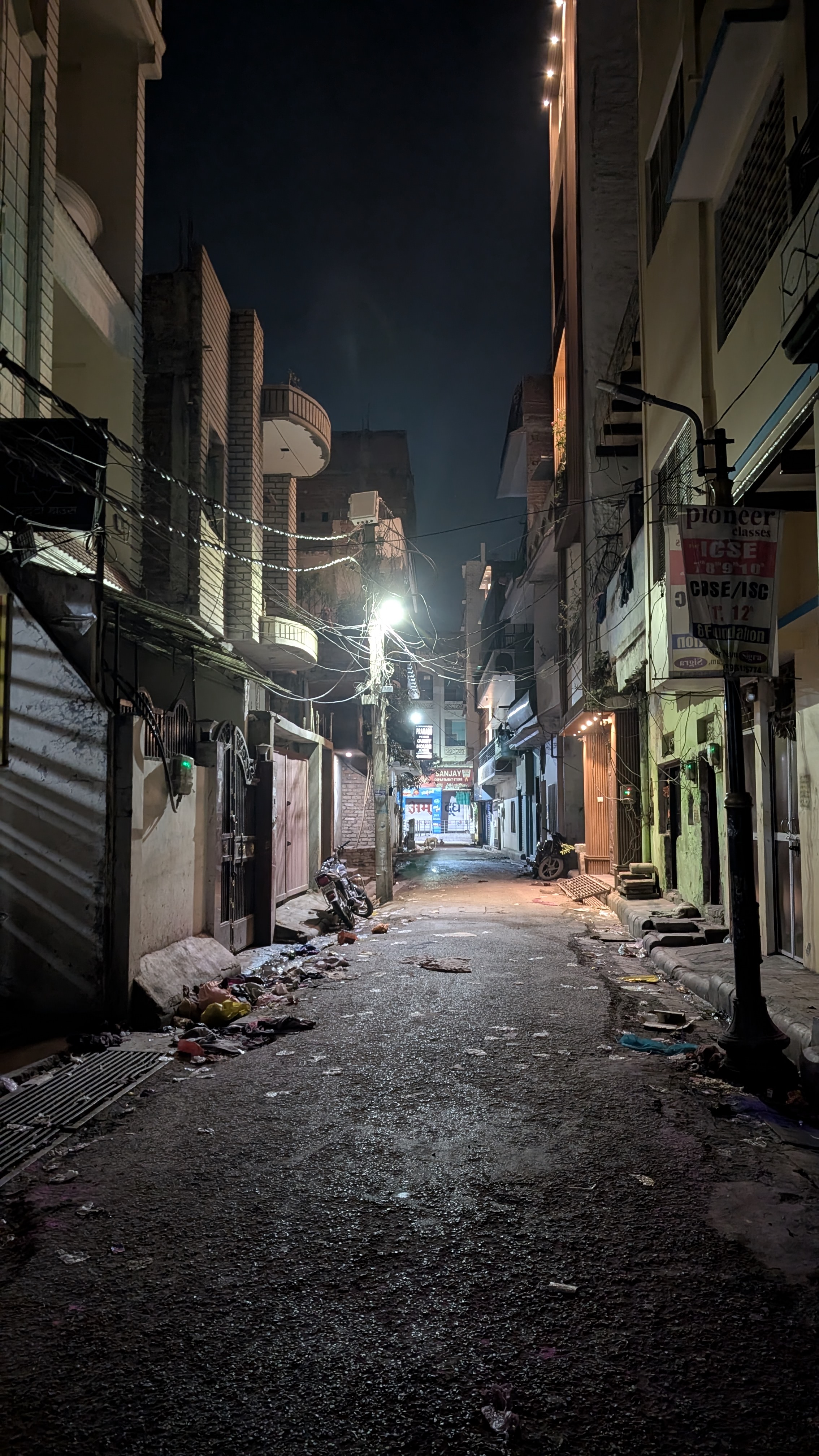 街灯だけがぼんやり照らす、静まり返ったバラナシの街。