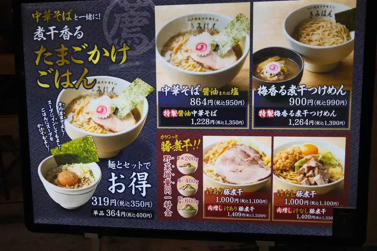 「江戸前煮干中華そば きみはん」のメニュー。煮干ラーメンやつけめん。