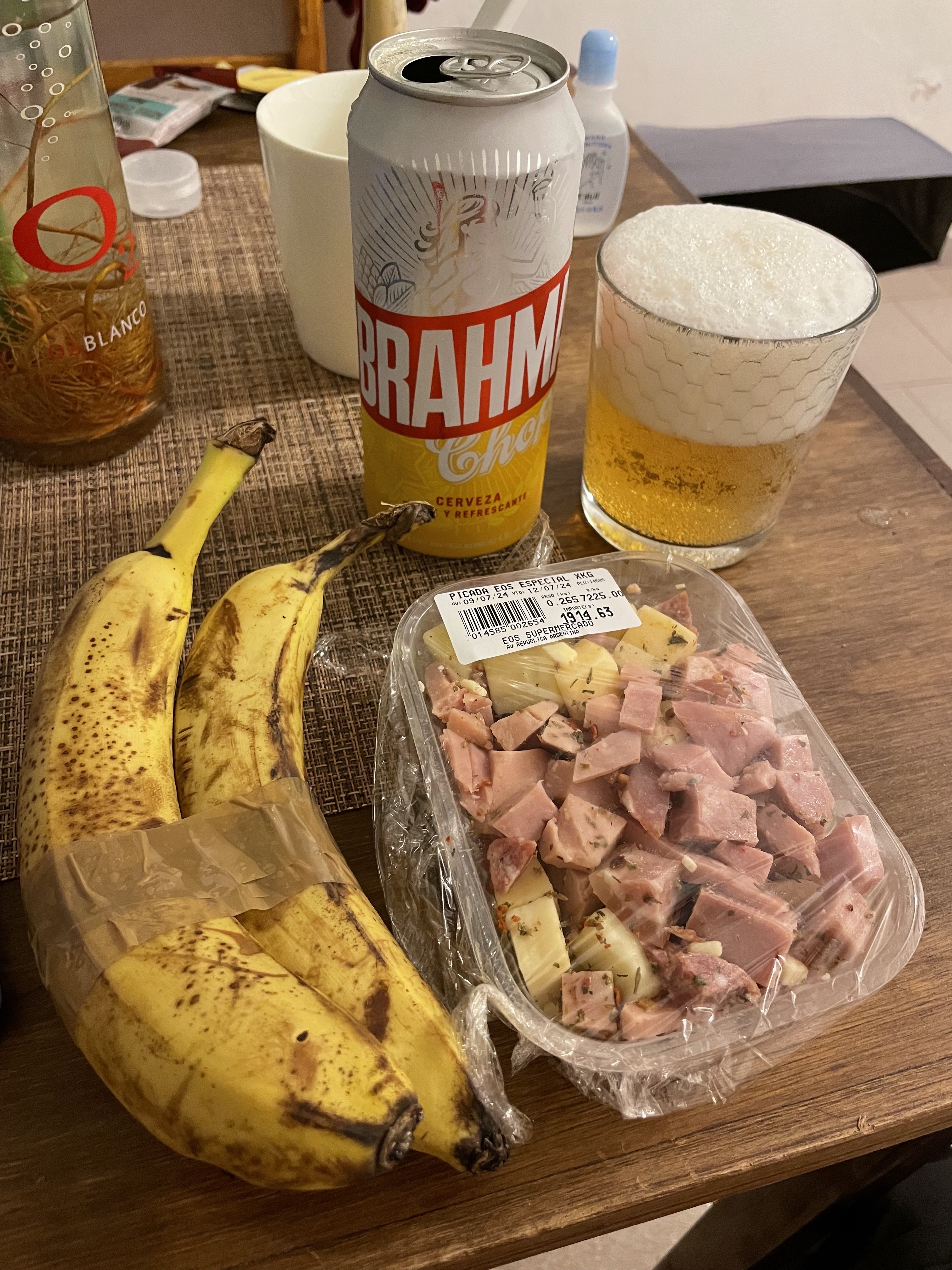 晩御飯の🧀、サラミミックスと🍺、そしてデザート用に🍎と🍌を購入