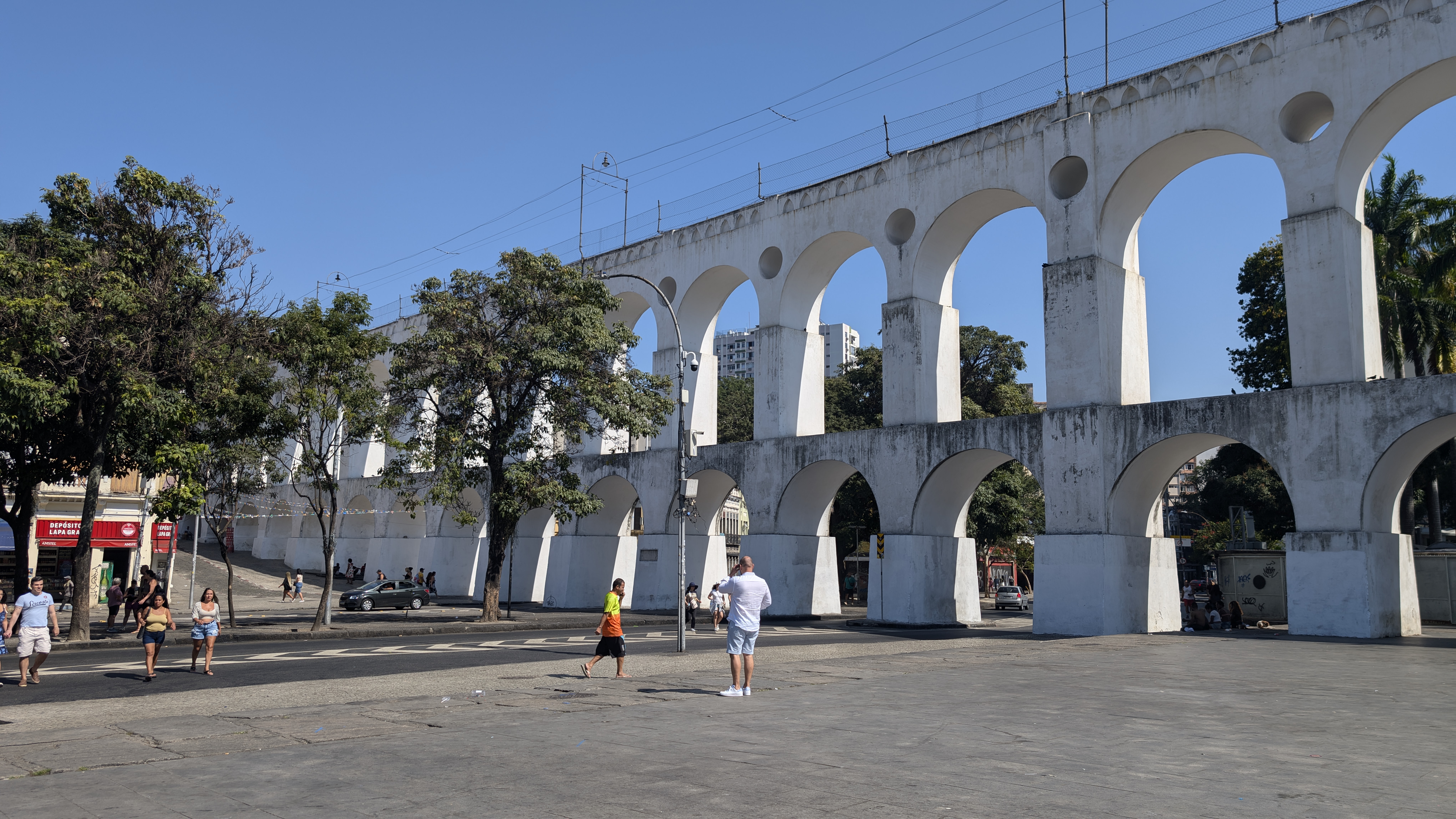 セラロン階段から徒歩数分、続いて訪れたのはカリオカ水道橋(アルコス・ダ・ラパ)白いアーチが並ぶこの水道橋は、リオの歴史的シンボルのひとつ。