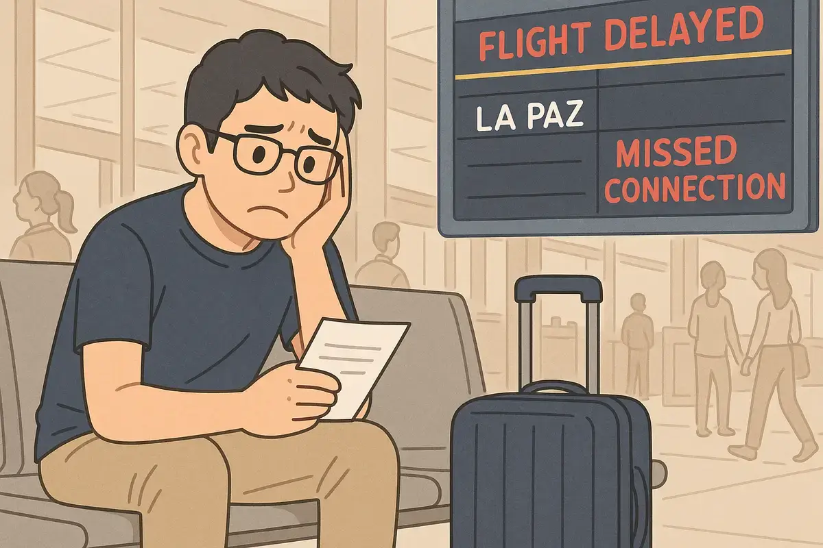 2時間以上の遅延を経て、ようやくラパスを出発した国内線のフライトは、予定よりかなり押してサンタ・クルス空港へ到着。⏰ 絶望の15分…間に合わなかった国際線乗継