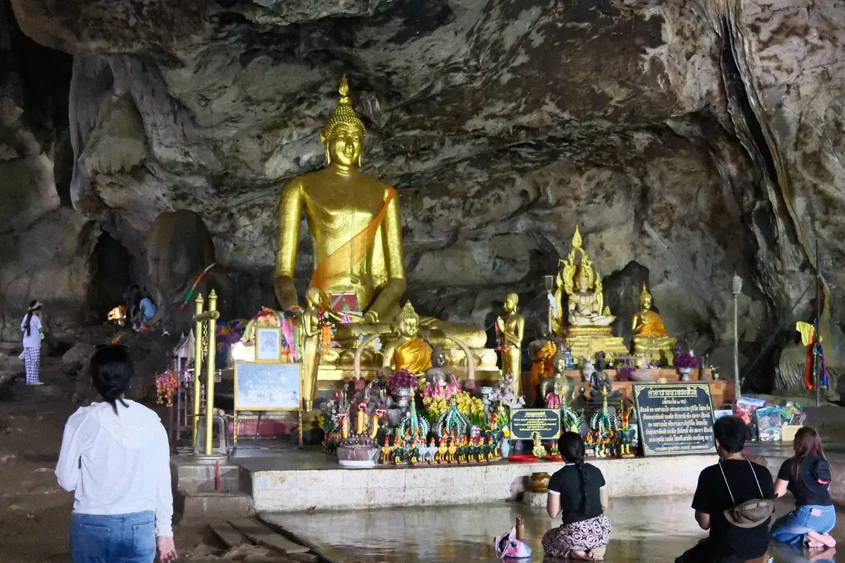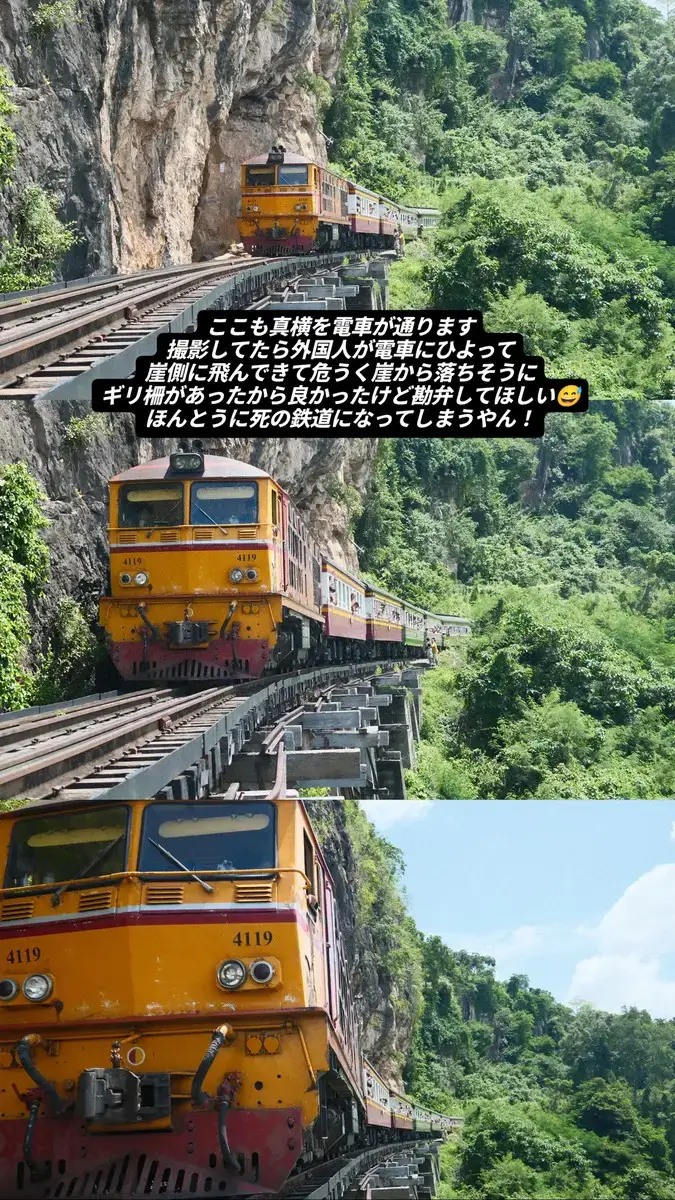 11時次に向かったのは、この旅のハイライトの一つ、タムクラセー橋(アルヒル桟道橋)です。 ここは断崖絶壁にせり出した木製の線路「死の鉄道(Death Railway)」として知られています 🛤️☠️ 当日は驚くほどの快晴で、日傘なしではいられないほどの暑さ☀️⛱️ 電車が来るまで時間があったので、中腹にある洞窟の中で涼みながら待機しました 🧗♂️❄️ タイの鉄道は自由度が高く、日本では考えられないことに線路の上を歩けます 🛤️😲 ベストポジションを求めて線路を進み、カメラを構えて待機 📸✨